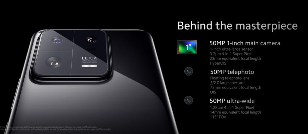 A Xiaomi 13 Pro Leica Vario-Summicron 1:19-2.2/14-75 ASPH kamerarendszere 14-től 75 milliméterig tartó gyújtótávolságot fog át: egy ultranagy, 1 hüvelykes IMX989 szenzorral ellátott 23 milliméteres, nagylátószögű főkamera, egy 75 milliméteres lebegő teleobjektív kamera, és egy 14 milliméteres ultraszéles látószögű kamera alkotja. Az IMX989 szenzor a Xiaomi 12S Ultra telefonon mutatkozott be először, és a legnagyobb szenzor, amit valaha okostelefonba beépítettek. Ez a hatalmas érzékelő a nagy dinamikatartománynak, a kiváló fényrögzítési képességeknek és rövid válaszidőnek is köszönhetően rendkívül színgazdag és éles, a textúrákat és az apró részleteket kiemelő felvételek készítését teszi lehetővé. A DSLR-kamerákra jellemző fókuszáláskor az okostelefon új, 75 milliméteres teleobjektíve jól kihasználja a lencse lebegését, ezzel ér el a 10 centimétertől a végtelenig tartó fókusztávolságot – vagyis a kamerával gyönyörű portrékat és a közelképeket lehet fotózni.