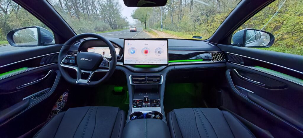 A belső térben a BYD a “Dragon Face” filozófiát alkalmazza, amely az autóiparban egyedi megközelítés. A dizájn kiemelkedően modern, a kormánykerék, az ülések és a műszerfal is futurisztikus érzetet kelt. A forgatható érintőképernyő, amely könnyedén vált a fekvő és álló mód között, igazán praktikus innováció. A minőségi anyaghasználat és az ergonómia is olyan élményt nyújt, amely a prémium kategóriába illik.