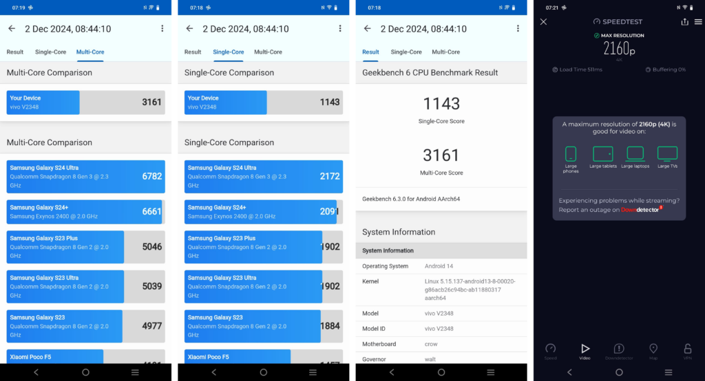 Teljesítmény tekintetében a Snapdragon 7 Gen 3 pontosan ott helyezkedik el, ahol várható: a Snapdragon 7s Gen 2 és a 7+ Gen 2 között. Bár a V40 elfogadhatóan teljesít, az árkategóriájában találhatók hatékonyabb chipszetek is. A vivo V40-ben található Adreno 720 GPU szilárd, de messze nem csúcskategóriás ebben az árszegmensben.