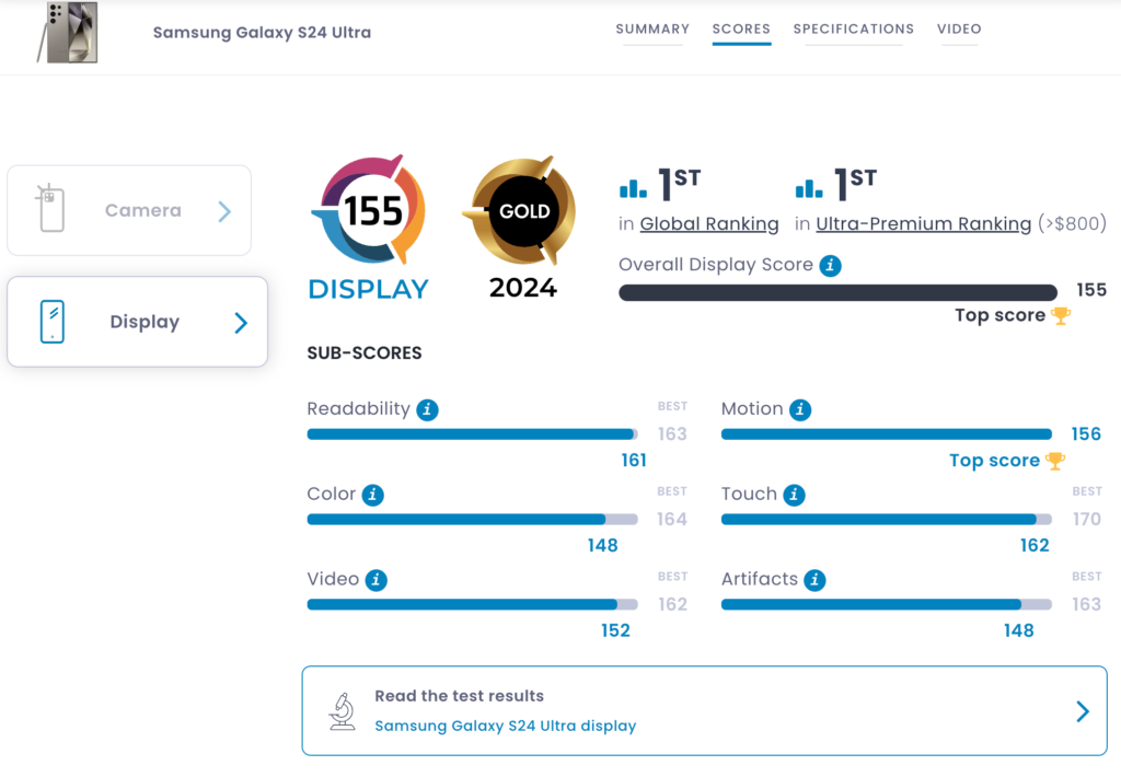 A Galaxy S24 Ultra vezeti a DxOMark Global és Ultra-Premium rangsorát a kijelző minőségét illetően, a Galaxy S24 és a Galaxy S24+ holtversenyben a 2. helyen áll a globális rangsorban. Szintén holtversenyben állnak a Pixel 8 és a Pixel 8 Pro modellekkel.