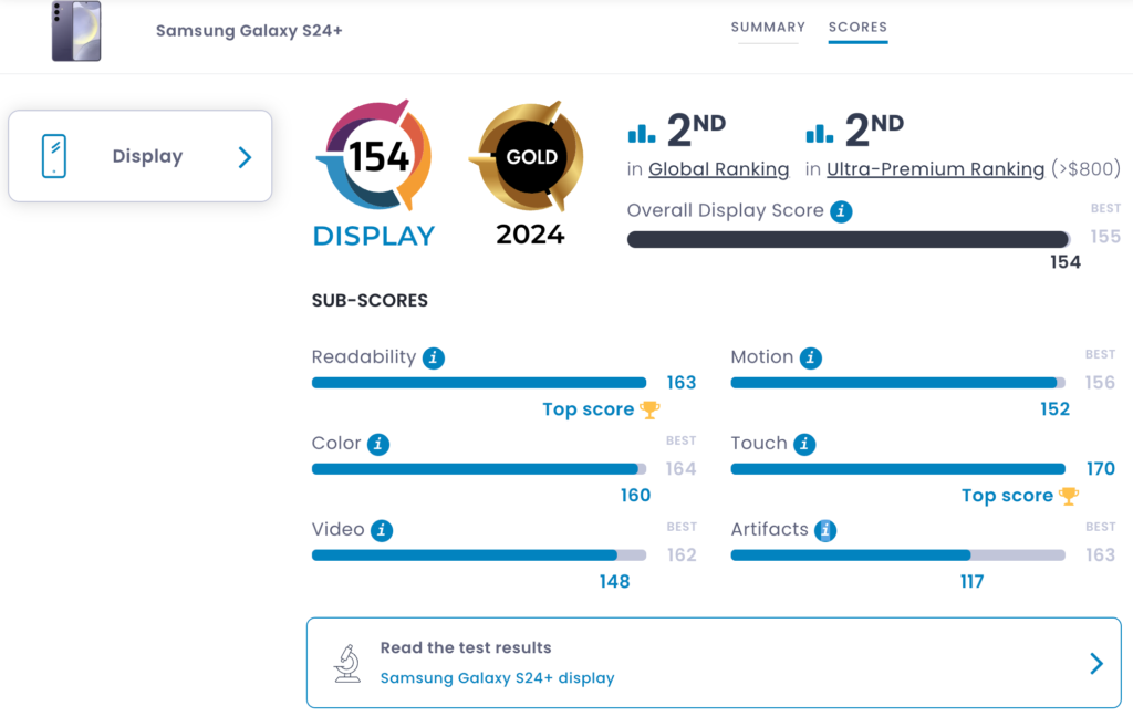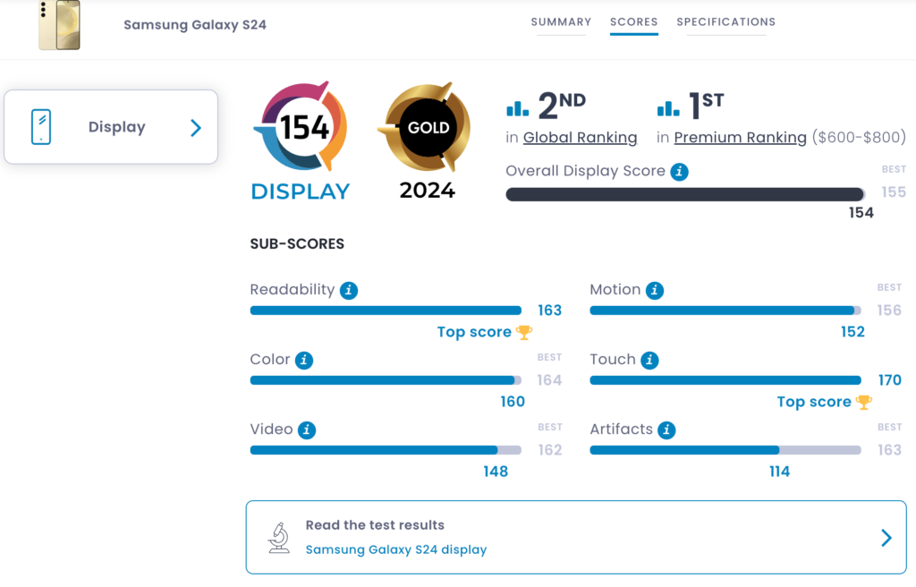 Az alap S24 modell rendelkezik a legmagasabb helyezést elért kijelzővel a prémium kategóriában, amelybe a 600 és 800 dollár közötti telefonok tartoznak. Ebbe a kategóriába nem tartozik a Galaxy S24+, ezért a Plus változat csak a második helyen áll a Galaxy S24 Ultra mögött az Ultra-Premium (800 dollárnál magasabb) szegmensben.