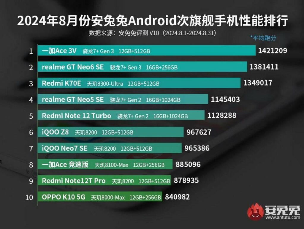Az AnTuTu minden hónapban két listát tesz közzé az előző hónapra vonatkozóan: egyet a zászlóshajó modellek, egyet pedig a felső-középkategóriás készülékek számára. A rangsor az előző hónap összes benchmark futásának átlagos pontszáma alapján készül (jelen esetben augusztus), és kizárja azokat a modelleket, amelyek kevesebb mint 1 000 futtatást értek el.