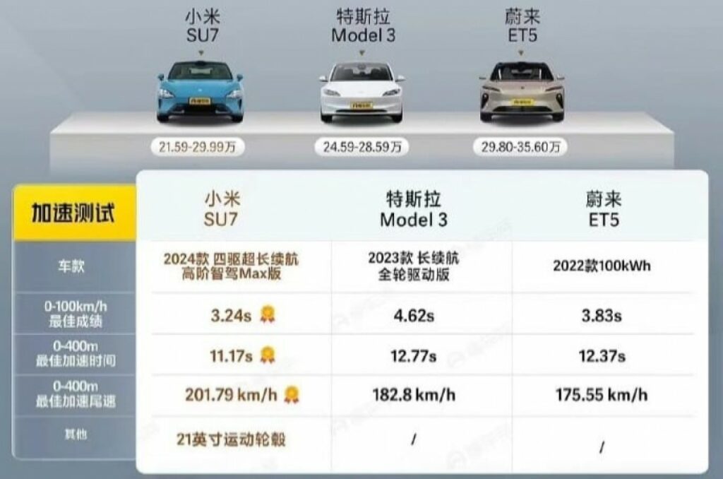 A Xiaomi SU7 nem csak a hatékonyságra koncentrál, meglepő ütőerővel rendelkezik a motorháztető alatt. A 0-100km/h gyorsulási teszteken az SU7 Max a visszapillantó tükörben hagyta a versenytársakat, és 3,24 másodperces időt ért el. Ezzel jóval megelőzte a Tesla Model 3 LR-t (4,62 másodperc) és a Nio ET5 LR-t (3,83 másodperc). A negyedmérföldes gyorsasági szakaszon az SU7 dominanciája 11,17 másodperces idővel folytatódott, bizonyítva, hogy ez az újonc nem fél megmutatni az izmait.