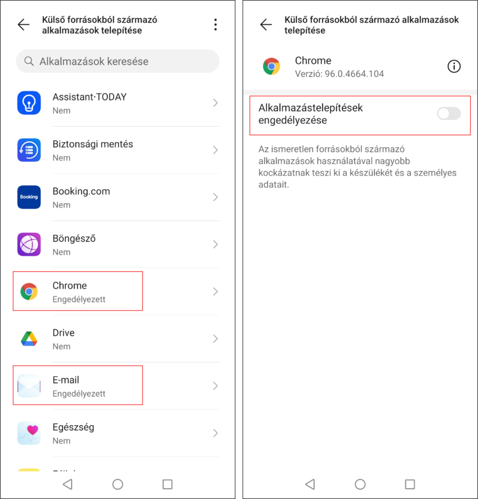 - Lépjünk a Beállítások » Biztonság » További beállítások » Külső forrásokból származó alkalmazások telepítése menüpontba!