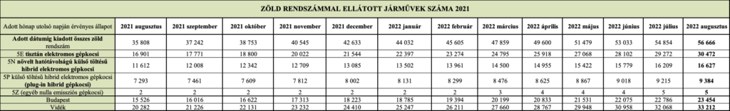 2022 augusztusában 1200 darab zéró kibocsátású gépjármű kapott zöld színű rendszámtáblát. Októbertől decemberig folyamatosan meghaladta vagy túl is lépte az ezres darabszámot a tisztán elektromos autók regisztrációja Magyarországon. Augusztusban az 5N növelt hatótávú kategóriába már csak 418 autó, míg az 5P konnektoros hibridból 169 darabra került zöld rendszám.