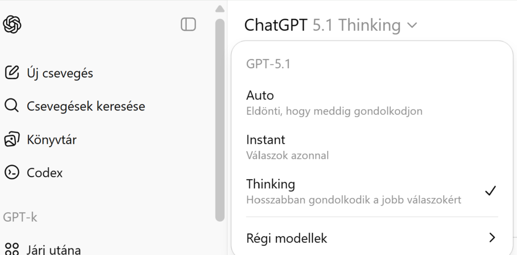 | GPT-5.1 Thinking | Összetett problémák, több-lépéses feladatok, precíz magyarázat | Hosszabb gondolkodási idő, részletesebb, átláthatóbb indoklás, kevesebb zsargon |