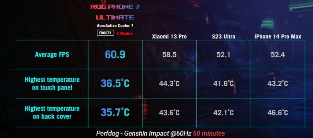 Az Asus az új sorozat játékteljesítményének jelentős javulásával büszkélkedhet. A GameCool7 hűtőrendszer nagyobb és jobb – bór-nitrid réteggel, kettős grafitlemezzel rendelkezik, amelyek együttes felülete 16 000 mm², ami 10%-os javulást tesz lehetővé a termikus hatékonyságban, gyors ciklusú párolgókamrával és a Snapdragon 8 Gen 2 által biztosított 15%-os hatékonysági előnnyel.