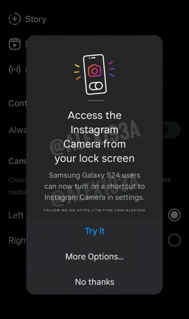 A Samsung Galaxy S24 telefonok az Instagram Kamera parancsikonjával bővülhetnek a zárolási képernyőn. A funkciót Alessandro Paluzzi, az X közösségi média egyik felhasználója fedte fel, ahol egy képernyőképet mutatott be.