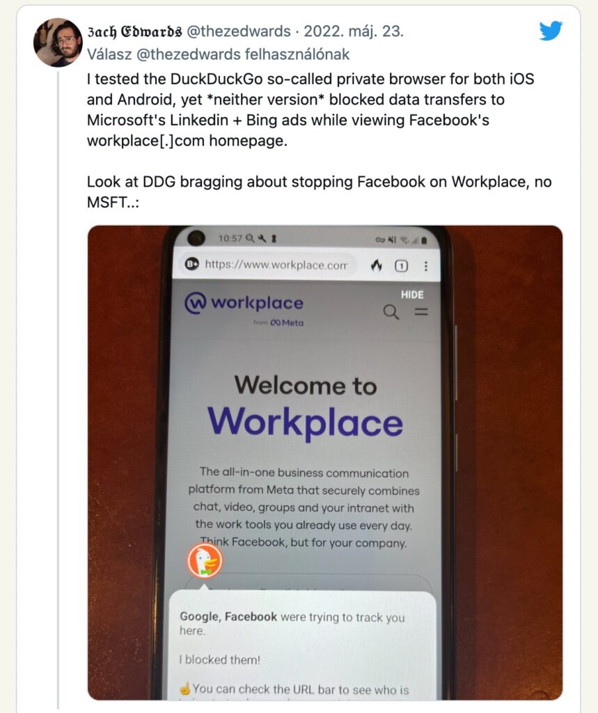 További tesztek azt mutatták, hogy a DuckDuckGo nem blokkolja a bing.com és linkedin.com doménekhez köthető trackereket, addig minden más trackert blokkol.