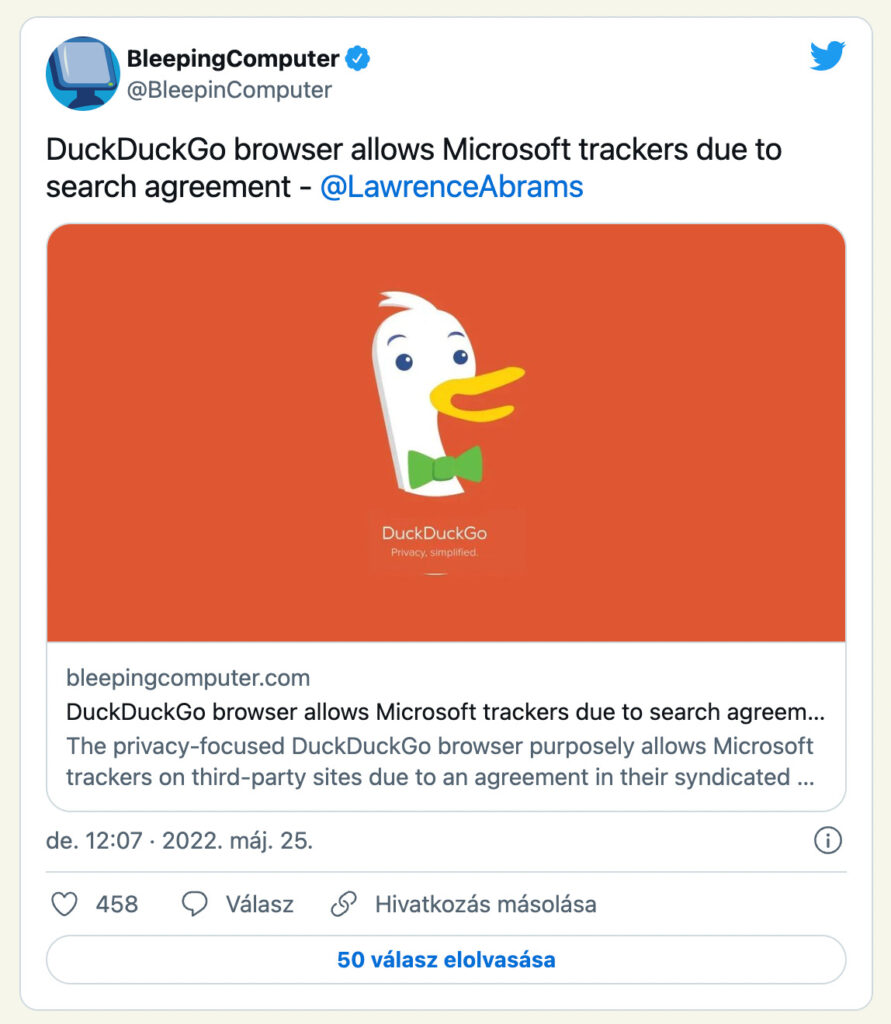 Össztűz alatt a DuckDuckGo, mert böngészője lehetővé teszi a Microsoft számára, hogy az monitorozza a böngésző felhasználóit.
