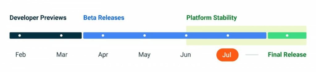 Ahogy az elmúlt években megszokott, a Google nem vállalt konkrét kiadási ablakot erre a véglegesített buildre, de ha a tavalyi év történései alapján indulunk ki, akkor biztosan nem lepődnénk meg, ha augusztusban érkezne. Erre utal erősen a Google idővonala is, amit alább láthattok.