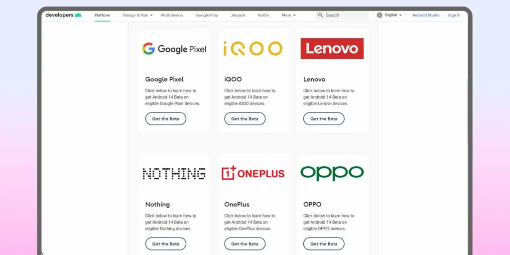 Ezek a változások mostantól a Google saját Pixel telefonjain kívül más eszközökön is elérhetővé válnak. A Google Android 14 Beta eszközökkel foglalkozó oldalán mostantól több különböző telefongyártóhoz készült útmutatókat mutatnak be, amelyeket maguk az OEM-gyártók írtak. Mivel minden egyes útmutatót az adott készülék gyártója írt, a lépések közvetlenül az adott készülékhez igazodnak, amit az adott készülék megkövetel.