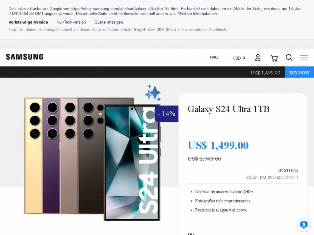 A Samsung Galaxy S24 256 GB-os modellje 1399 dolláros, 1049 dollárra csökkentett árcédulával szerepel, míg a Galaxy S24 Ultra 1 TB-os változata 1749 dolláron szerepel, 1499 dollárra csökkentve.