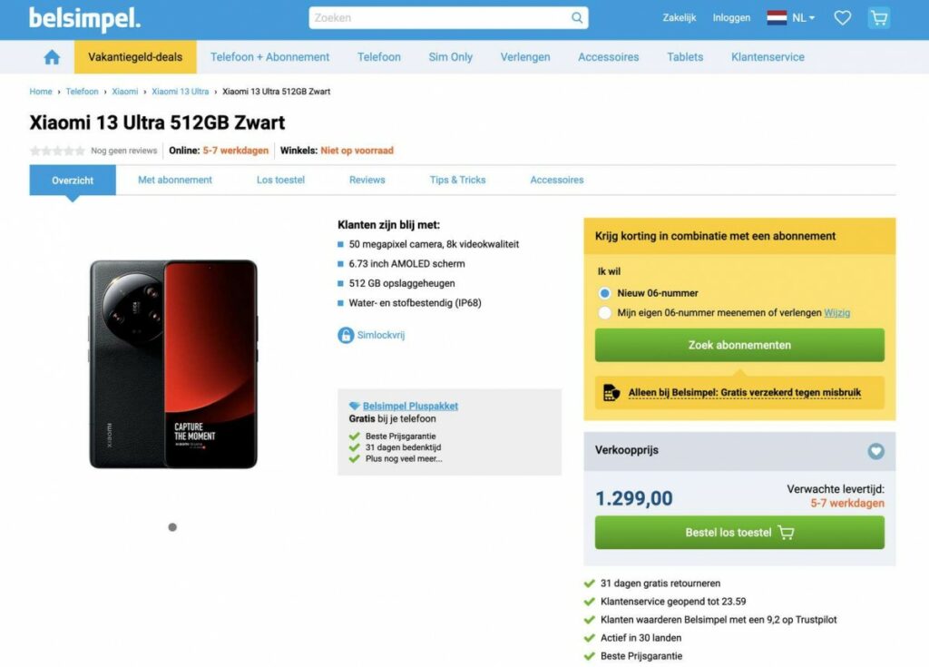 A holland Belsimpel kiskereskedő és a német Gomibo-nál a Xiaomi 13 Ultra Hollandiában 1299 euróért, Németországban 1277 euróért, Írországban pedig 1320 euróért szerepel a listán, a telefont 5-7 munkanapon belül szállítják.