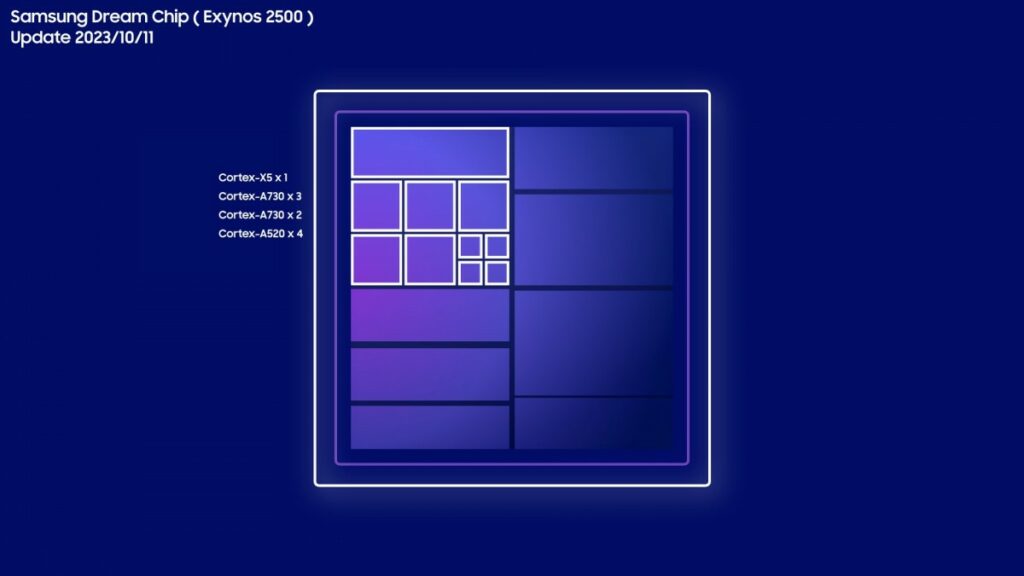 Az Exynos 2500 processzorában állítólag egy legalább 3,2 GHz-es órajelű Cortex-X5 mag, három 2,3 GHz és 2,5 GHz közötti órajelű Cortex-A730 mag, két további Cortex-A730 mag és négy hatékonyságra összpontosító Cortex-A520 mag található.