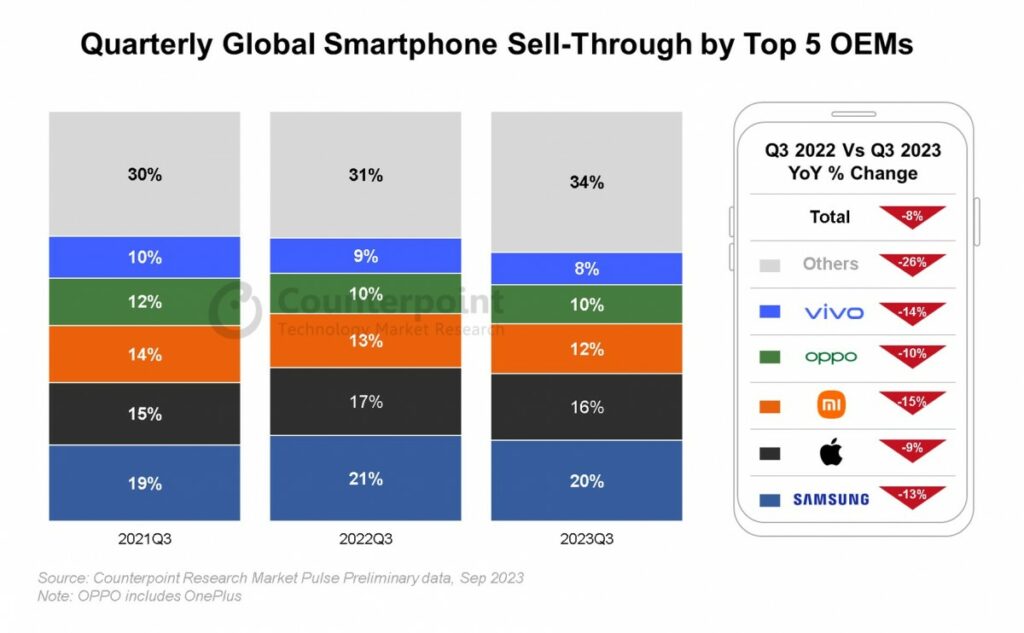 Az okostelefonok globális eladási aránya a július-szeptemberi időszakban 8%-kal csökkent a tavalyi év azonos időszakának értékeihez képest. A Counterpoint legfrissebb jelentése szerint a csökkenő eladások fő oka a lassuló fogyasztói kereslet. A piac a harmadik negyedévben a második negyedévhez képest enyhe, 2%-os növekedést ért el, ami valószínűleg az iPhone 15 sorozat múlt havi bevezetésének köszönhető.