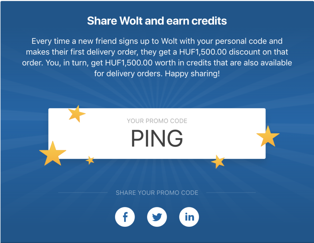És akkor nyitott a Wolt Budapest felé és elkezdett nyomulni. A recept nem más, pont ugyanazt csinálják, mint amit az Uber, Airbnb és társai. Oszd meg, csatlakozzon minden barátod és ha csatlakozáskor beírjátok a promó kódot, akkor mindenki jól jár, mert 1500 Ft üti mindegyiktek markát a regisztráció utáni első rendelésből.
