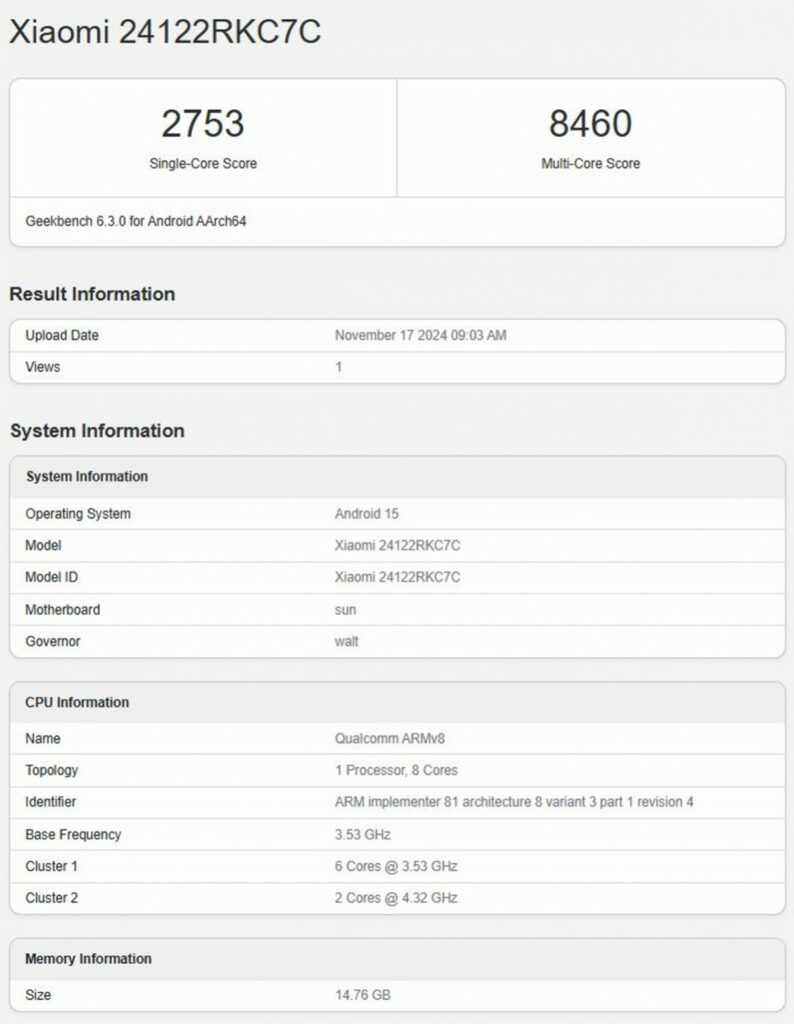 A Redmi K80 Pro megjelent a Geekbench adatbázisában, ahol 2 753 pontot ért el az egymagos, és 8 460 pontot a többmagos teszten – ezek az eredmények összhangban vannak más telefonok CPU benchmarkjaival. A 24122RKC7C modell Android 15 operációs rendszert futtat, és úgy tűnik, hogy a Redmi ismét kínál majd 16 GB RAM-mal rendelkező verziót. A lapkakészlet megerősítést nyert, hogy az új Qualcomm zászlóshajó, 2×4,32 GHz-es Oryon V2 Phoenix L és 6×3,53 GHz-es Oryon V2 Phoenix M magokkal.