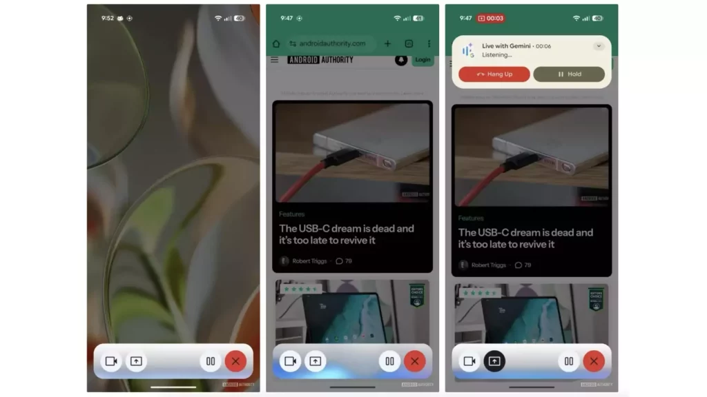 Hangvezérlés, képernyőmegosztás: Továbbra is elérhetőek a fő funkciók – hangvezérlés, képernyőrögzítés, miközben a Gemini reagál a vizuálisan látott tartalomra is.