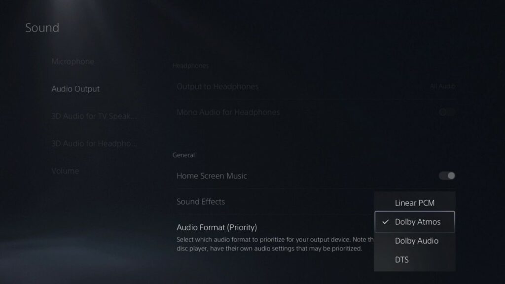 A PS5 Tempest 3D AudioTech-et támogató játékok lejátszása közben a konzol szükség esetén Dolby Atmos-ban kódolja a hangot, így az Atmos-kompatibilis hangszórókra, soundbarra vagy televízióra is kimehet. Ez magában foglalja a magassági csatornák támogatását is. Ez a konzolon történik, így a játékokat nem kell frissíteni az Atmoshoz, és továbbra is használhatják a Tempest 3D AudioTech-et, ahogy eddig is.
