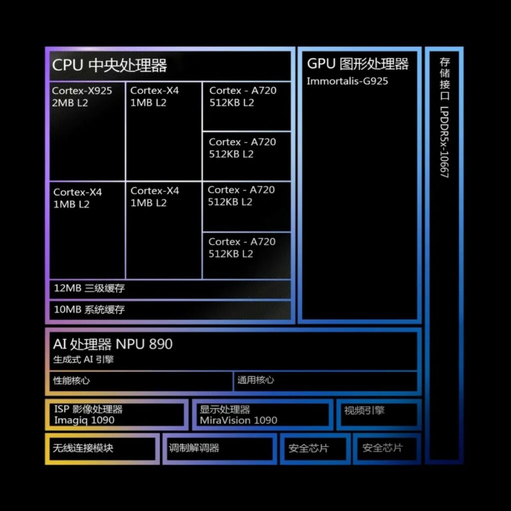 A CPU architektúrája 1+3+4 felépítésű. A szuper-teljesítményű mag a Cortex-X925, amely 3,63 GHz-en fut, emellett 3 Cortex-X4 egység található, amelyek maximális frekvenciája 3,3 GHz. Az energiahatékonyság érdekében négy Cortex-A720 egység is van 2,4 GHz-en.