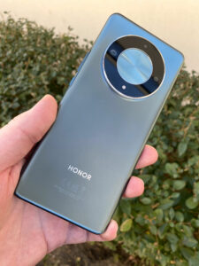 A műanyag hátlapon, amely az általunk tesztelt Emerald Green változatban (van Sunrise Orange és Midnight Black is) szerencsére nem vonzza az ujjlenyomatokat, két koncentrikus kört találunk, amelyek a kamerákat és a vakut foglalják magukba. Idén azonban a Honor ezt a struktúrát bordázott fémmel vette körül, hogy az egy óra lünettájára hasonlítson. Egy kis stílus, amit nagyra értékelünk.