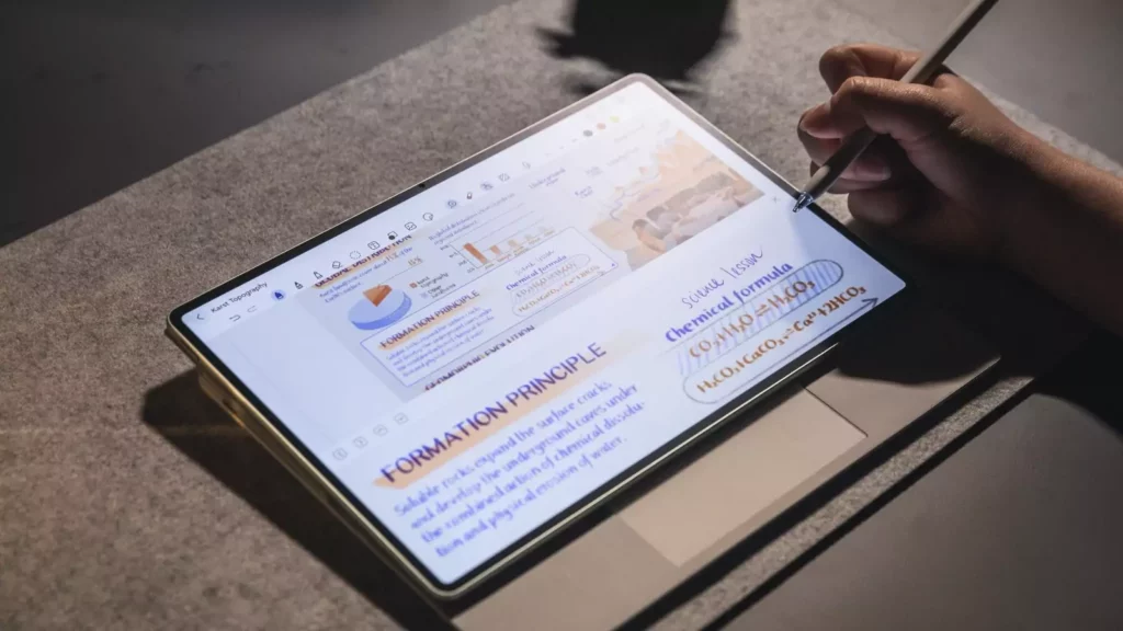 M-Pencil (3. gen, NearLink): 16 384 nyomásszint, alacsony késleltetés, stabil párosítás. A kézírás-élményt a Notes AI Handwriting Enhance finomítja, a GoPaint pedig realisztikus 3D-ecseteket, animációs eszközöket és „True-Colour” ecseteket kínál.