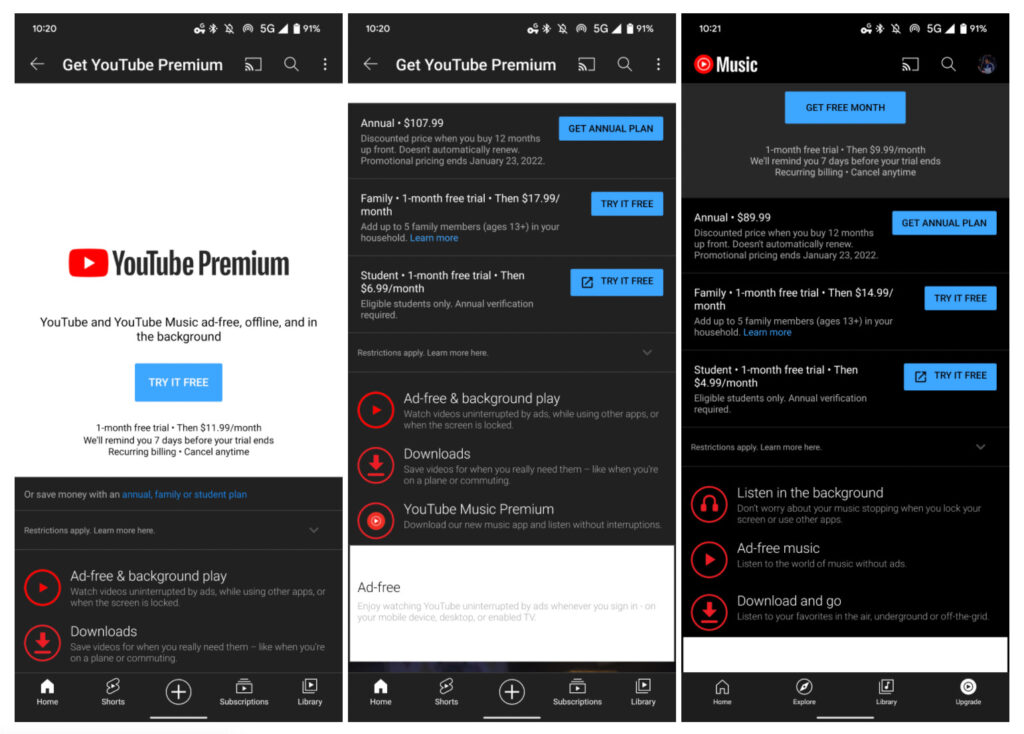 A YouTube Premium és a YouTube Music Premium új előfizetői a „Takaríts meg pénzt éves, családi vagy diákcsomaggal” opciót láthatják a szokásos előfizetés/„Próbáld ki ingyen” gomb alatt. Az utóbbi két ajánlat már jó ideje létezik, de az éves előfizetési opció újdonság.