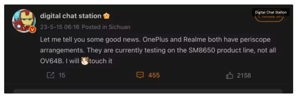 A OnePlus következő zászlóshajó telefonja jelentős kamerakorszerűsítést hozhat. A Weibo-n szivárogtató Digital Chat Station szerint a vállalat jelenleg egy periszkópos kamerát tesztel az “SM8650” termékcsaládban, ez pedig valószínűleg a OnePlus 12 modellszáma, amely egyébként Qualcomm Snapdragon 8 Gen 3 processzorral érkezhet majd meg.