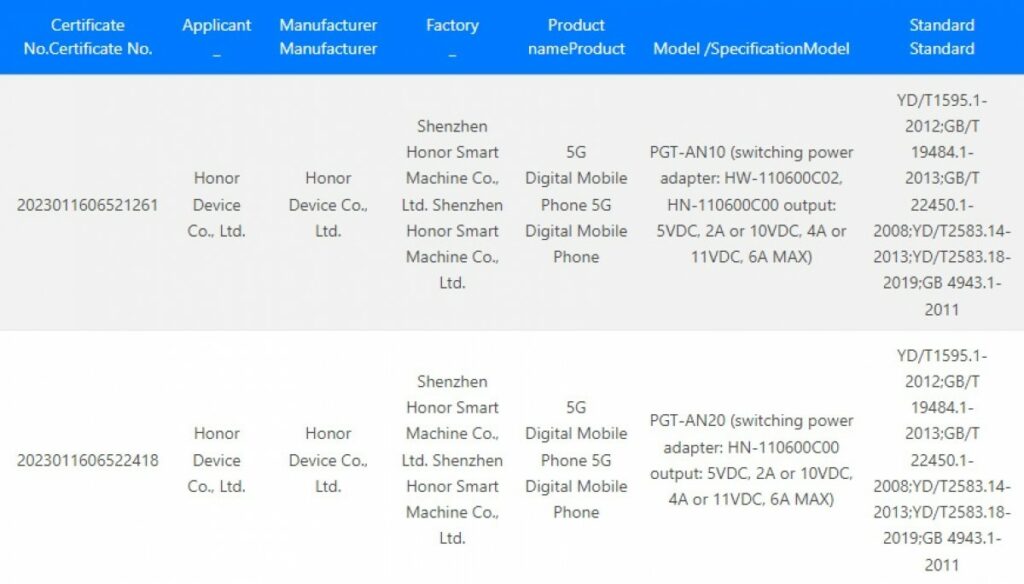 A PGT-AN10 (a Honor Magic 5 Pro modellszáma) és a PGT-AN20 (azaz a Honor Magic 5 Ultimate) támogatja a HW-110600C00 töltőt, amelyhez 66 W-os Honor SuperCharge tartozik. A telefonok 40 W-on is tölthetők, ha van kéznél régebbi adapter.