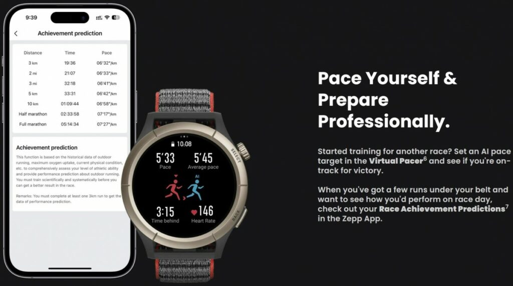 A futóknak szánt egyéb funkciók közé tartozik a Virtual Pacer, a Race Achievement Prediction és a Track Run Mode. A Virtual Pacer segítségével beállíthatsz egy AI tempócélt, és ha már van néhány futásod, a Race Achievement Prediction segítségével megnézheted, hogyan teljesítenél a verseny napján.