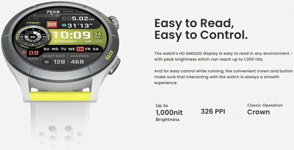Beszéljünk először az Amazfit Cheetah Pro óráról. Úgy hirdetik, mint “prémium órát elit futóknak, akik optimalizálni szeretnék teljesítményüket”, és egy 1,45″-os Always-On AMOLED kijelzőt tartalmaz 480×480 pixeles felbontással. Gorilla Glass 3 védi, és 1000 nits csúcsfényerővel rendelkezik, hogy a képernyőn megjelenő információk erős napfényben is olvashatóak legyenek. A kijelző emellett több mint 100 óraszámlapot is támogat.