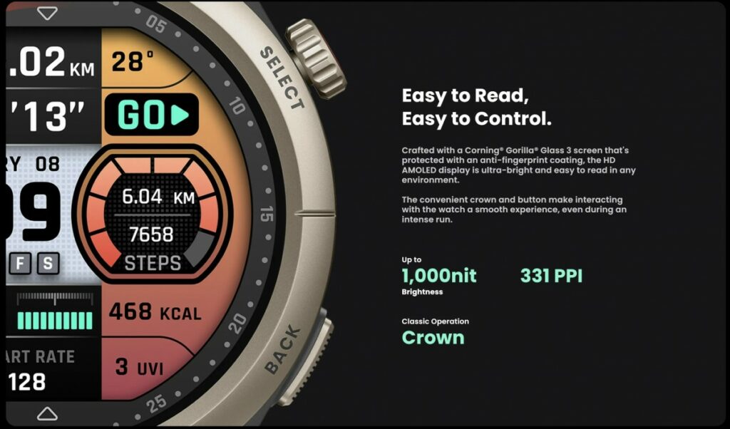 Beszéljünk először az Amazfit Cheetah Pro óráról. Úgy hirdetik, mint “prémium órát elit futóknak, akik optimalizálni szeretnék teljesítményüket”, és egy 1,45″-os Always-On AMOLED kijelzőt tartalmaz 480×480 pixeles felbontással. Gorilla Glass 3 védi, és 1000 nits csúcsfényerővel rendelkezik, hogy a képernyőn megjelenő információk erős napfényben is olvashatóak legyenek. A kijelző emellett több mint 100 óraszámlapot is támogat.