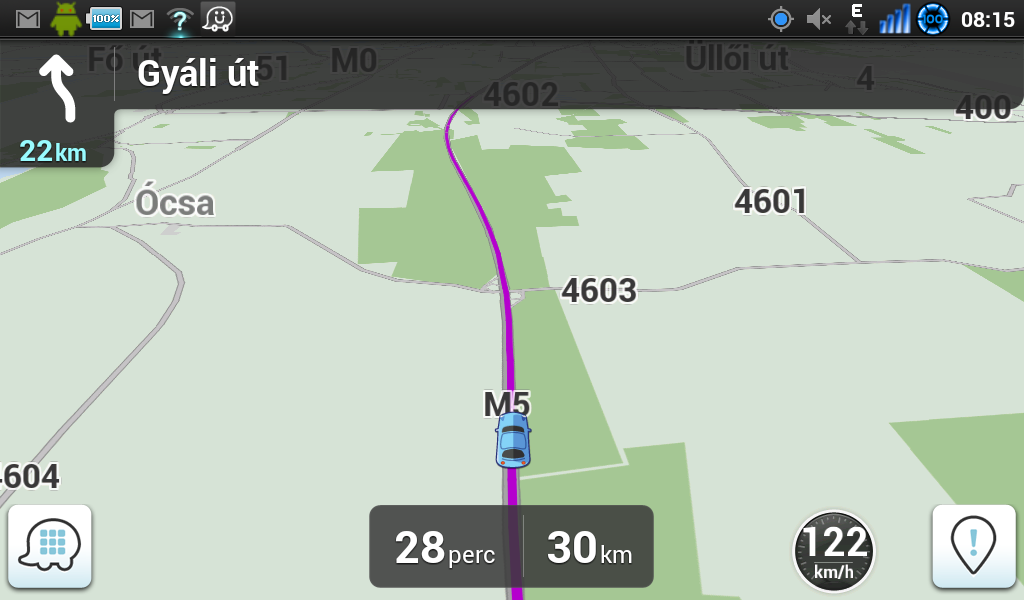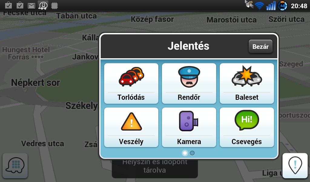 A jobb oldali “jelentések” gomb megnyomásakor, vagy elhúzásakor rögtön tárolódik a pozíciónk, az eseményt kiválasztva pedig vagy megadjuk az adatokat, vagy a waze 10 másodpercen belül lekicsinyíti azt, hogy a vezetésre figyelhessünk.