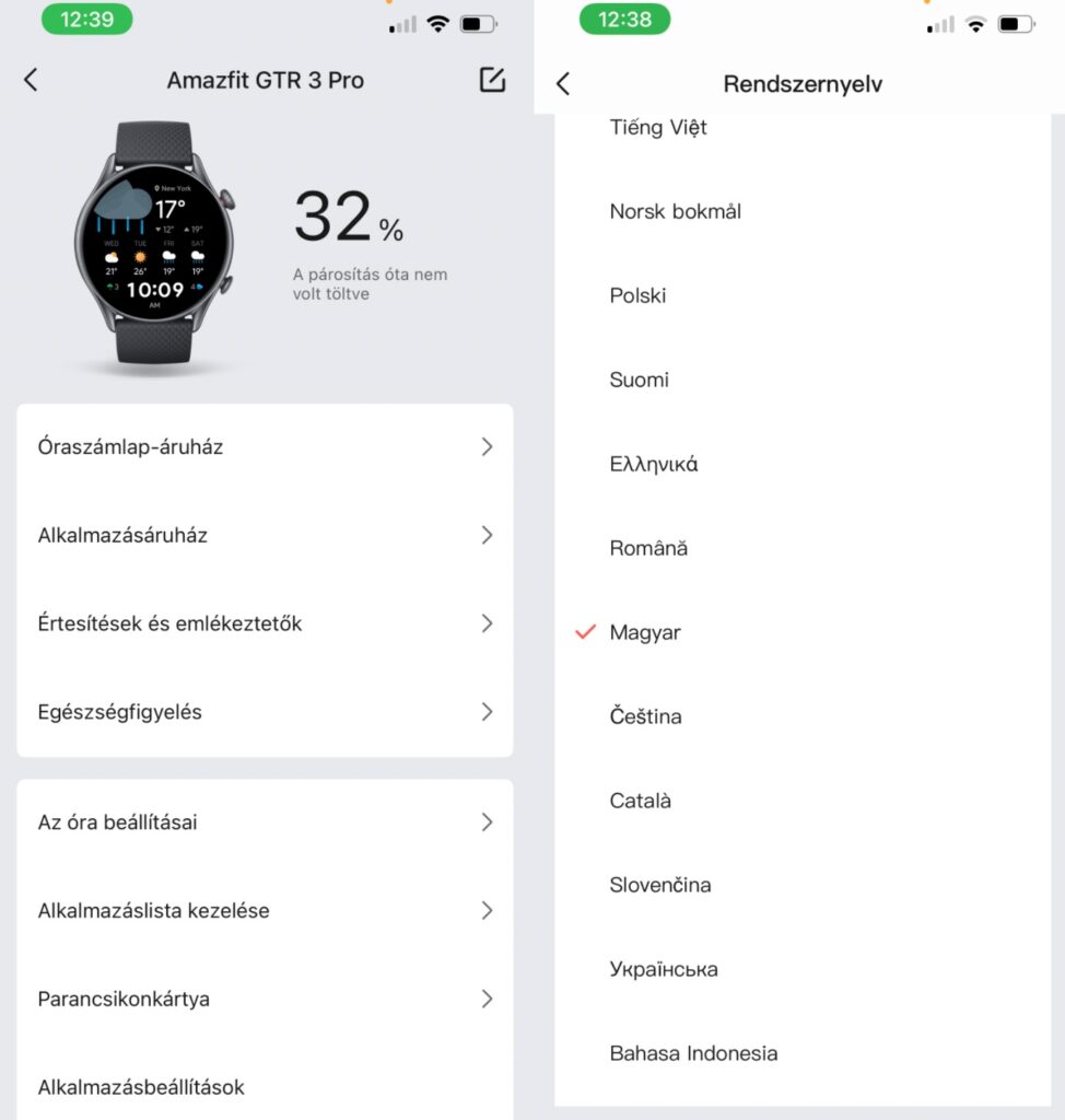 Ez a fenti és a lenti képsorokon is látszik, egy Amazfit GTR 3 Pro modellen néztük meg a magyar menüpontokat, de az egész 3-as sorozatra érvényes a nyelvbeállítás lehetősége (GTR 3, GTS 3).