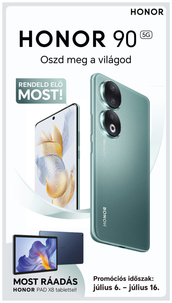A HONOR 90 július 7-16-a között az eMag-nál előrendelhető 239.990 Ft -os áron, az ajánlat keretein belül minden telefon mellé jár egy HONOR Pad X8 táblagép is.