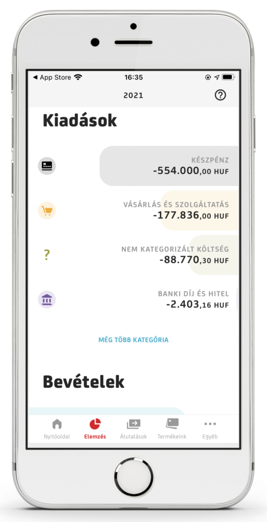 Az UniCredit Bank megoldása az egyik legfejlettebb költségelemző szolgáltatás a hazai banki mobilappok közül. Költésekkel arányos oszlopok mutatják a havi bevételeket és a költségeket. Alatta láthatók az adott hónapban bekategorizált költések. Mindez a bal-jobb oldali lapozással átváltható a hónapok között.