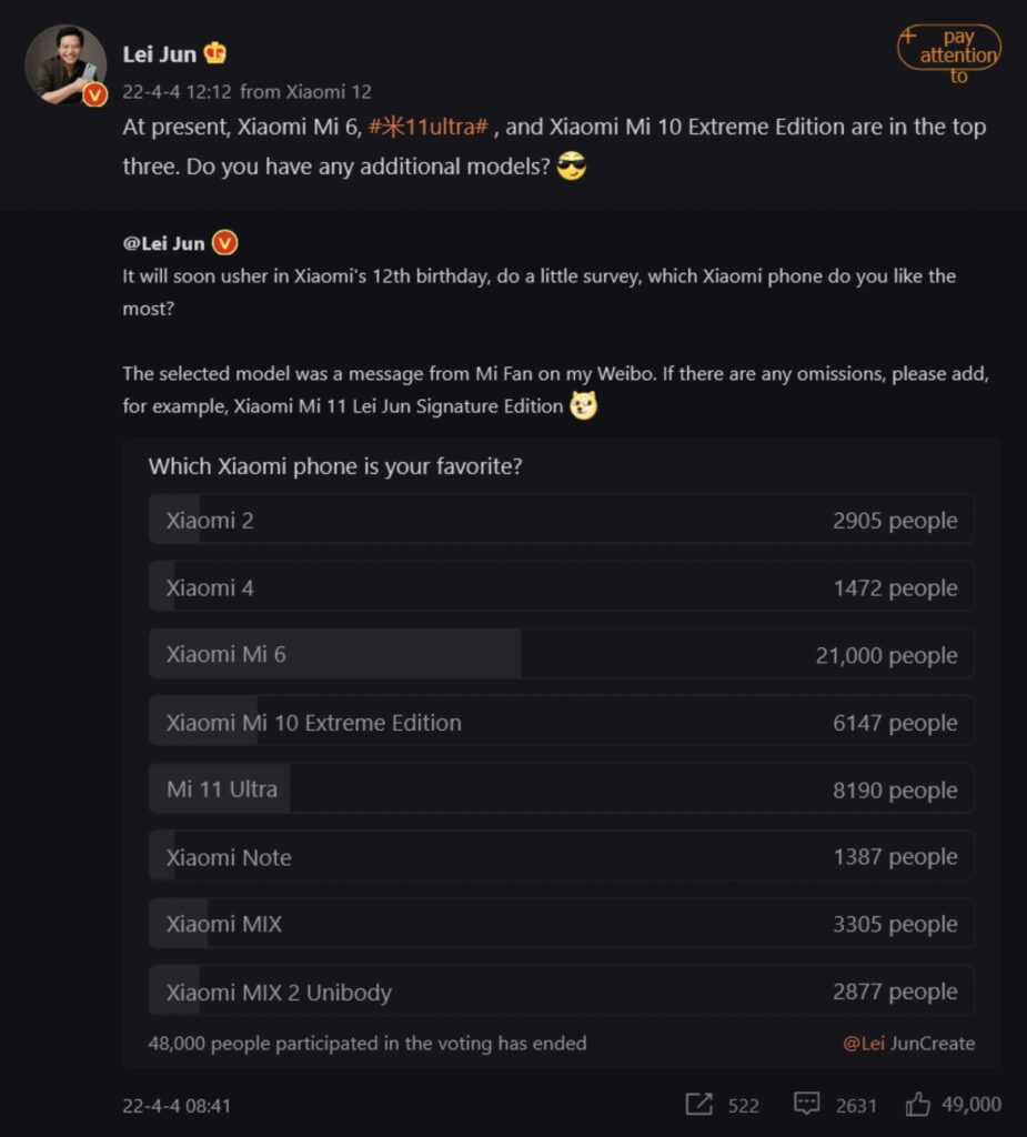 Lassan már 12 éves lesz a Xiaomi, hiszen 2010-ben alapították az azóta már globális nagyságokat öltő vállalatot. Egytucat esztendő alatt pedig voltak különösen jól sikerült telefonok, amiket a rajongók azonnal a szívükbe zártak. Lei Jun pedig egy közvéleménykutatás eredményeit tette közé a napokban, ahol a legutóbbi csúcstelefonokra lehetett szavazni.