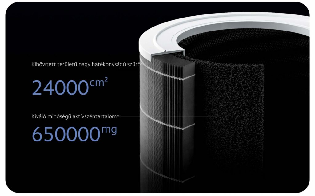 A Xiaomi Smart Air Purifier 4 nem egy kis készülék. A készülék egy hatalmas 3 az 1-ben szűrővel rendelkezik, amely akár egy évig (használattól függően) számos szennyező anyagot képes bent tartani. A nagy felülettel és a minőségi aktív szén tartalmával ez egy rendkívül hatékony szűrő, amely az előszűrőből (a nagyobb részecskéket, például a háziállatok szőrét fogja fel), a Xiaomi nagy hatékonyságú szűrőjéből (az apró, akár 0,3 mikronos részecskéket is felfogja) és a kiváló minőségű aktív szénből (a káros gázokat és szagokat fogja fel) áll.