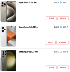 A listát sokáig vezető Samsung Galaxy A54 feljött a hatodik helyre, ezzel a hetedik helyre szorította a Redmi Note 13 Pro-t. Az Apple iPhone 15 és 15 Pro a nyolcadik, illetve a kilencedik helyre került, míg a Redmi Note 12 zárja a táblázat ezen részét.