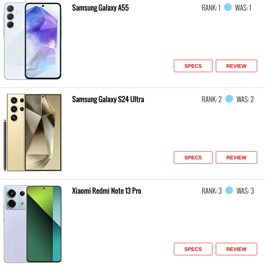 Harmadik hete ugyanaz a dobogós helyezés a GSMArena trend táblázatában. A Samsung Galaxy A55 továbbra is a Samsung Galaxy S24 Ultra és a Redmi Note 13 Pro előtt van a dobogó tetején.