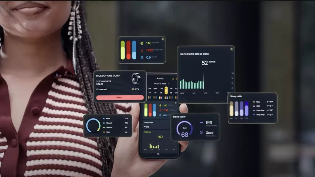 A ONE Ultra mögötti koncepció egyszerű: a gyűrű legyen vállalható ékszer és hasznos kütyü egyben. A ház hipoallergén cirkónia kerámiából készül, súlya és profilja pedig annyira visszafogott, hogy egész nap hordható – edzéshez, munkához, alváshoz is. A belső szenzorsor a mai okosgyűrűk „must have” repertoárját hozza: folyamatos pulzusfigyelés, SpO₂-mérés, stressz- és terhelésbecslés, részletes alvásnapló REM-szinttel, valamint automatikus sportfelismerés több mint százötven mozgásformára. A kísérőalkalmazás elérhető Androidon és iOS-en; a felület a napi „jóllétet” helyezi középpontba, könnyen értelmezhető trendgrafikonokkal és heti összesítőkkel.