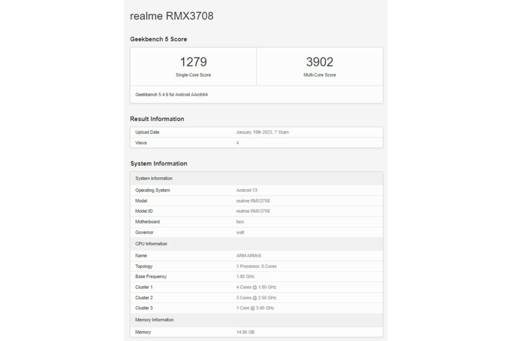 A szóban forgó prototípus 16 GB RAM-mal rendelkezik, és nem meglepő módon Android 13-at futtat. Modellszáma RMX3708, a benchmarkban megjelölt alaplap pedig a már említett Snapdragon 8+ Gen 1 SoC.