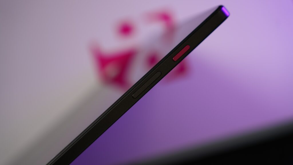 A tablet anyag felhasználása alumínium és műanyag keveréke, robosztus, jól össze van rakva, bár az illesztés lehetne pontosabb aműanyag és az alu test között. A készülék vékony, 7.8mm, így kellemes a fogása, állított formában egy kézzel is könnyen megtartható. A rövidebb oldalakon van 1-1 hangszóró, tehát sztereó, a hosszabbik oldalakon az egyiken a sim tálca van – ami egy nano simet és egy max 2 terrás microsd kártyát tud befogadni, míg a másik hosszú oldalon a hangerőgombok és a magenta színű bekapcsológomb található. A bekapcsológomb elrendezése elég rossz helyen van, azt szokni kell, véleményünk szerint a rövidebbik oldalra kellett volna helyezni. Ami viszont nincs, az a jack, ami ebben a kategóriában azért szokatlan.