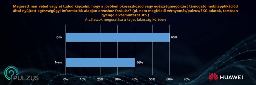 A növekvő bizalmat jelzi, hogy a válaszadók 60 százaléka fordult már, vagy elképzelhetőnek tartja, hogy a jövőben orvoshoz fordulna az okoseszközéből nyert információk alapján – például nem megfelelő pulzusszám, vagy esetleg tartósan gyenge alvásmintázat miatt. A férfiakra jellemzőbb, hogy orvoshoz fordulnának ilyen esetben, mint a nőkre (64, illetve 57 százalék).