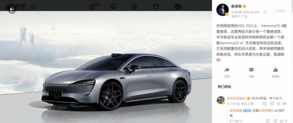 Richard Yu, a Huawei fogyasztói üzletágának és intelligens autós megoldások egységének vezérigazgatója a Weibo-n hozta nyilvánosságra a hírt, és részleteket osztott meg a Huawei Zhixuan autóipari részlegének első, tisztán elektromos meghajtású kupéjáról. Ez a jármű lesz az első, amely a HarmonyOS 4 operációs rendszerrel rendelkezik majd, ami nemcsak a vállalat, hanem az autóipar számára is jelentős mérföldkövet jelez.
