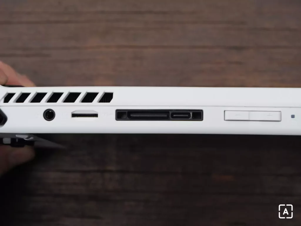 A kijelző és a menü gombok a kijelző két oldalán találhatók, valamint az Asus szoftveres funkcióinak dedikált gombjai. Ezután a készülék tetején a váll- és kioldógombok találhatók, textúrázott felülettel. A kettő között találhatók a hangerőszabályzó gombok, egy USB-C port, egy 3,5 mm-es csatlakozó, egy memóriakártya-nyílás, ventilátornyílások és egy csatlakozó egy külső grafikus kártya számára.