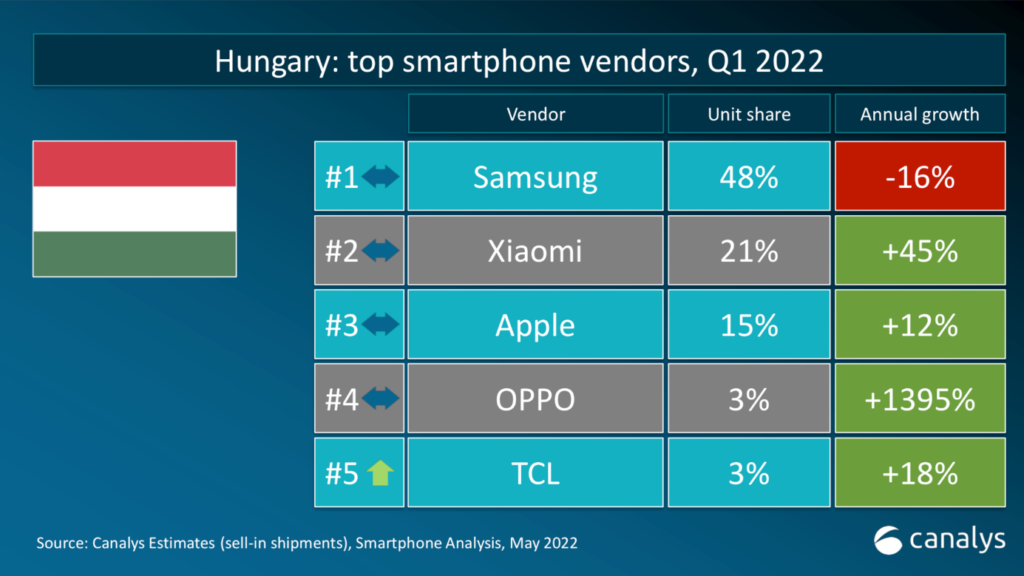 A Canalys vezető piackutató szerint Magyarországon a Xiaomi 21%-os részesedéssel továbbra is második szereplő a magyar okostelefonpiacon, a társaság 2021 negyedik negyedéve óta tartja ezt a pozíciót. A Xiaomi éven belüli növekedése a magyar piacon 2022 első negyedévében 45% volt.