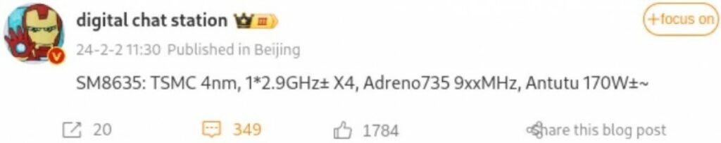 A hír a Digital Chat Station megbízható tippadójától származik, aki szerint az SM8635 a TSMC 4 nm-es node-ján készül, és egy 2,9 GHz-es órajelű Cortex-X4 magot tartalmaz, a grafikusan intenzív feladatokat pedig az Adreno 735 GPU fogja ellátni. A DCS azt is állította, hogy az SM8635-nek 1,7 millió körüli AnTuTu pontszáma van.